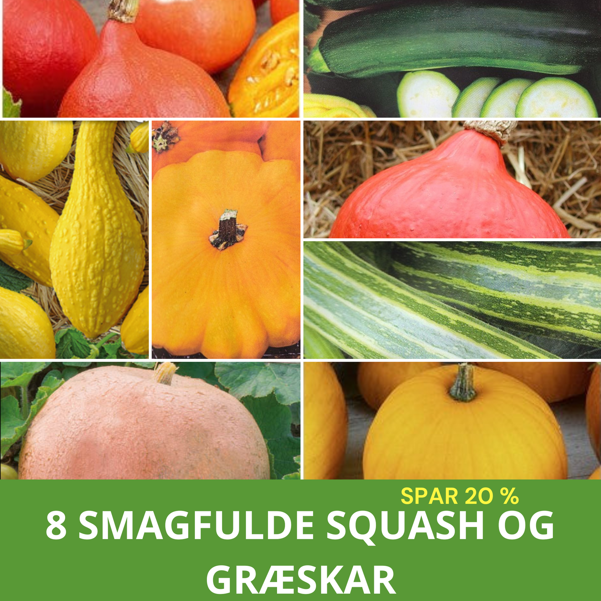 Pakken indeholder frø fra 8 forskellige, spændende varianter af squash og græskar, så der er noget for enhver smag og til mange forskellige formål.