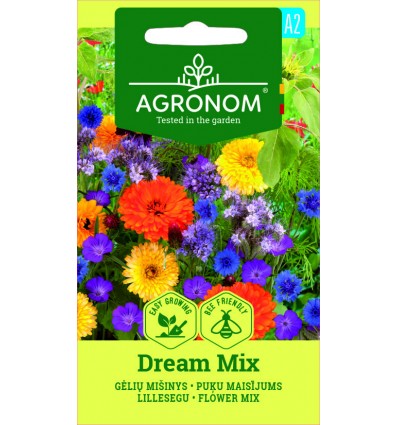Frø af blomsterblandingen 'Mix Dream' der er en farverig blanding af et-årige blomster til sommerblomsterbede. Blandingen indeholder 23 blomsterarter, der blomstrer hele sommeren. Velegnet til blomsterhaver og potter. Forkultiver frøplanter for tidligere blomstring. Blomsterne i blandingen vil tiltrække sommerfugle, bier og fugle til blomsterbedene.