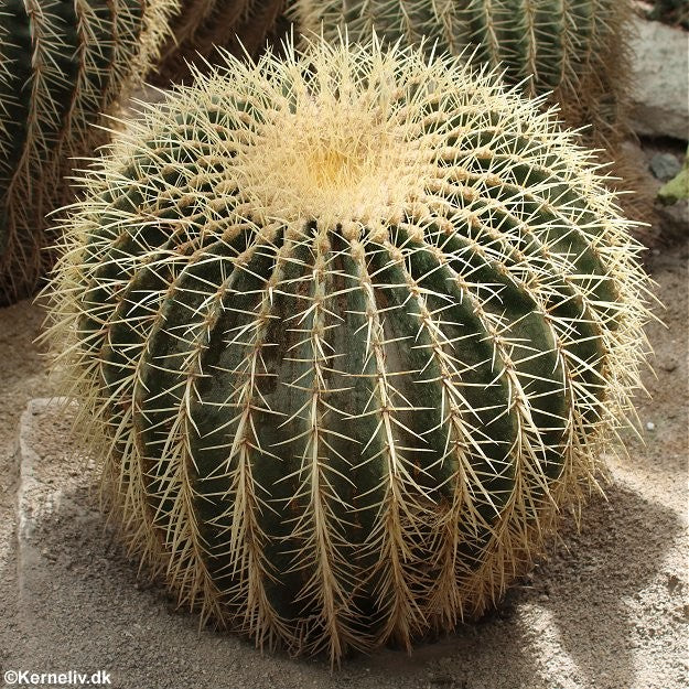 Hurtigvoksende, kugleformet kaktus med gyldengule torne.