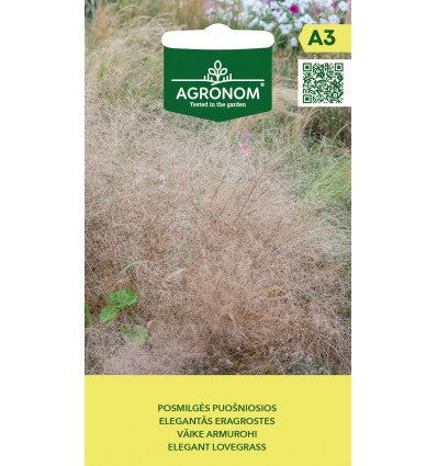 Frø af Eragrostis Elegans, en etårig, dekorativ, urteagtig plante, 50 cm høj, prydet med smukke blade og blomsterstande. De blomstrende blomsterstande skaber en lyserød tågeeffekt i blomsterbedet. Velegnet til kantbeplantning, anvendelse i naturlige blomsterbede og kan også plantes i potter.
