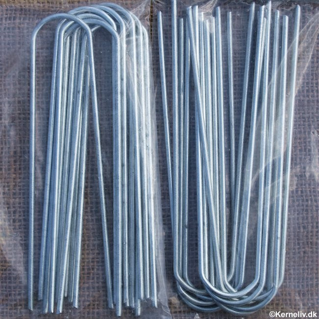 Fæstningskroge til fastgørelse af forskellige typer af fiberdug, ukrudtsdug, fuglenet og væv. Krogene stikkes igennem materialet og ned i jorden.