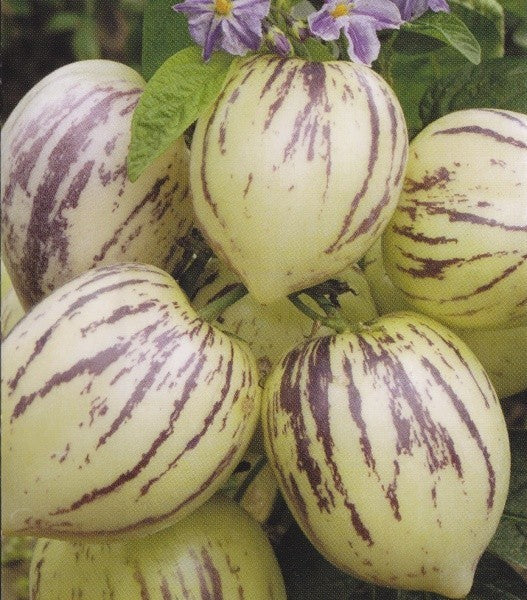 Spændende plante fra Sydamerika, der udvikler ovale gule frugter, som er smukt dekoreret med violette striber. De er omkring 10 cm. lange.