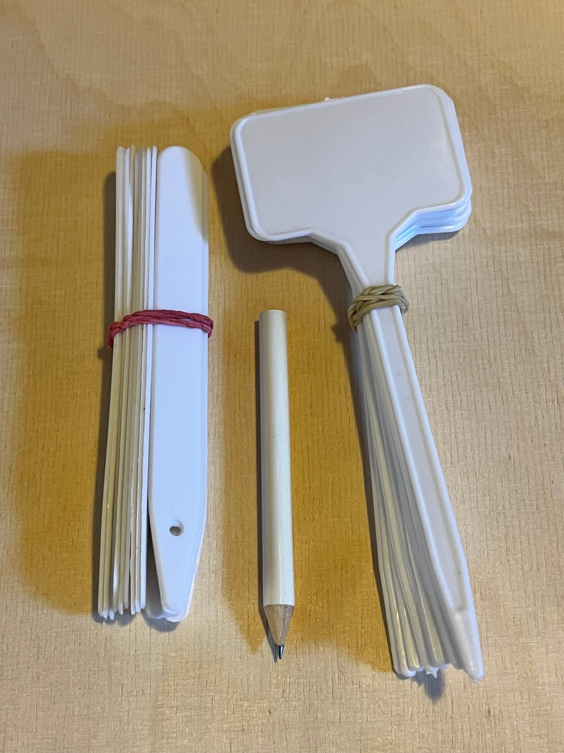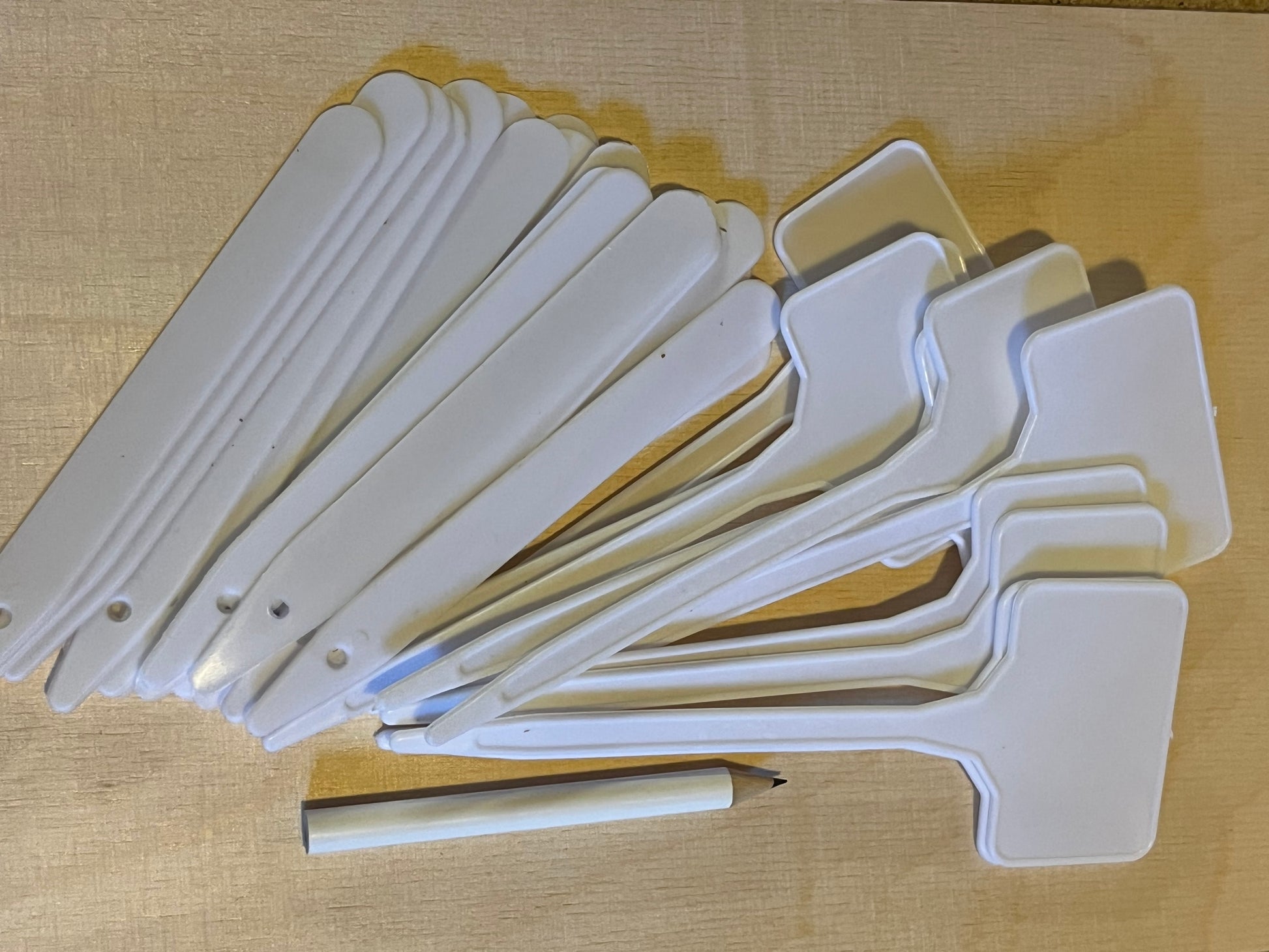 Planteskilte i hvid plast med tilhørende blyant. Sættet indeholder 20 af de smalle og 10 af de brede planteskilte samt en blyant. I alt 31 dele.