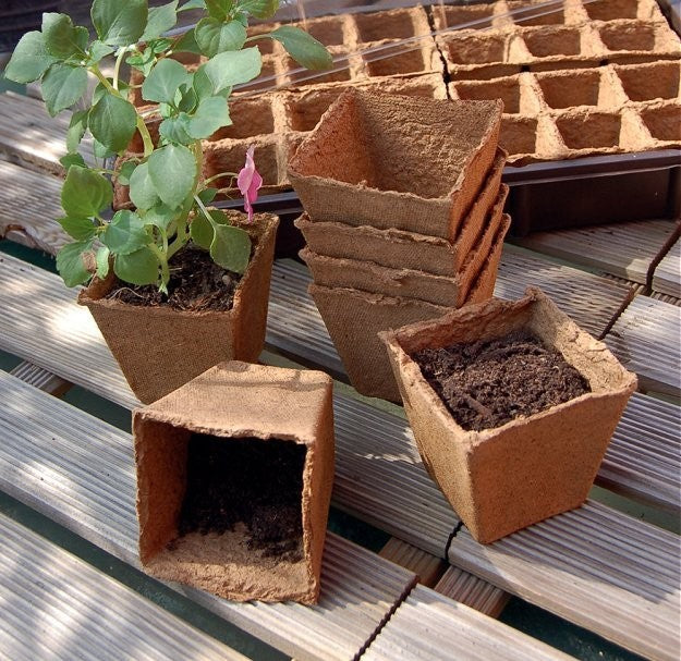 Disse nedbrydelige potter kan plantes direkte ud i jorden sammen med frøplanten.