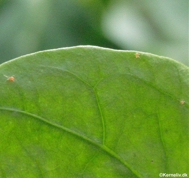- Hver 3. dag undersøges bladene ved forsigtigt at vende disse og kigge på undersiden med en lup. Er der røde rovmider til stede, hvor man finder spindemider, så vil rovmiderne efter 2-3 uger bekæmpe spindemiderne.