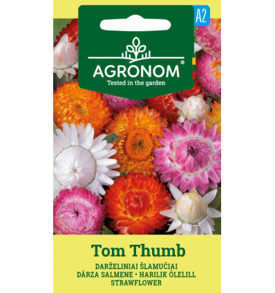 Frø af evighedsblomsten 'Tom Thumb'. Planten er et-årig og blomsterne er 5–6 cm i diameter, lyse og bruges til tørre buketter og blomsterarrangementer. De tørres i et mørkt, godt ventileret rum med stilkene opad. Trives bedst i let, fugtig jord.