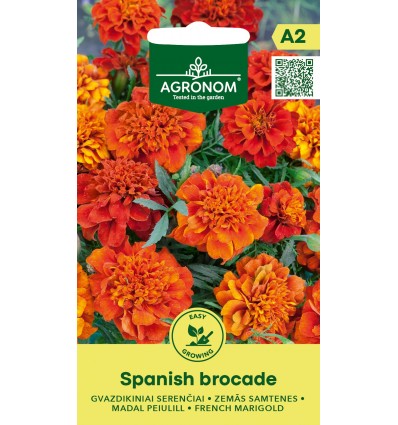 Frø af tagetes  'Spanish Brocade' - en etårige blomst, der er elsket af mange haveejere. Blomsterne er 5–6 cm i diameter. Ubesværet med hensyn til jord og lette at vedligeholde. Velegnede til plantekasser, blomsterbede, kirkegårde og potter. Fjern visne blomster efter blomstring for at fremme og forlænge blomstringen.