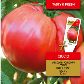 Medium-Sen og høj tomatsort der giver store kæmpetomater på ca 1 kilo stykket. Ciccio er gammel italiensk tomatsort, der giver et højt udbytte af nærmest pinkfarvede tomater næsten uden kerner.