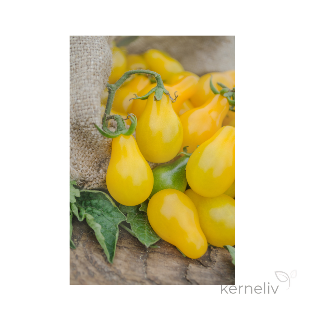 Tomatfrø af den højtydende sort Perun, som er høj og rank plante med pæreformede gule tomater, der vejer 15-20 g.