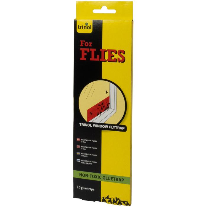 Pakken indeholder 10 stk. Trinol Window Flytrap-strips. Fælden indeholder ingen giftige stoffer og er klar til brug. Fælden er en effektiv løsning til detektion og fangst af fluer. Den kan anvendes som indikator for, om der er brug for at sætte ind med yderligere bekæmpelse.