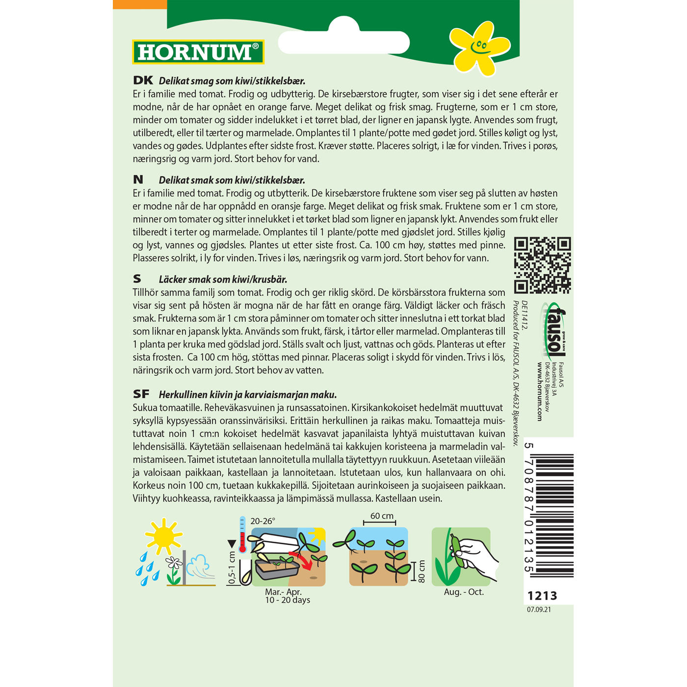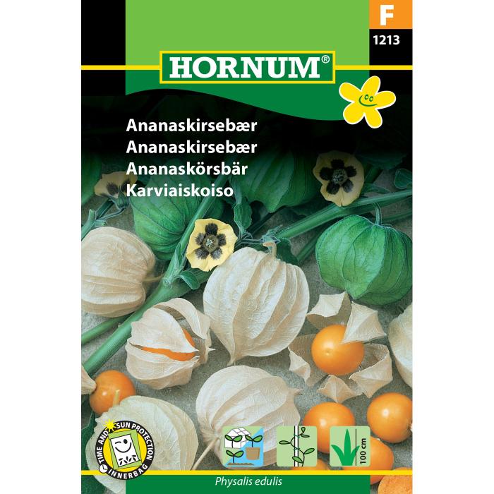 Frø af den spændende plante Ananaskirsebær, der er i familie med tomat. Frodig og udbytterig plante. De kirsebærstore frugter, som viser sig i det sene efterår er modne, når de har opnået en orange farve. Meget delikat og frisk smag. Frugterne, som er 1 cm store, minder om tomater og sidder indelukket i et tørret blad, der ligner en japansk lygte. Anvendes som frugt, rå, eller til tærter og marmelade.