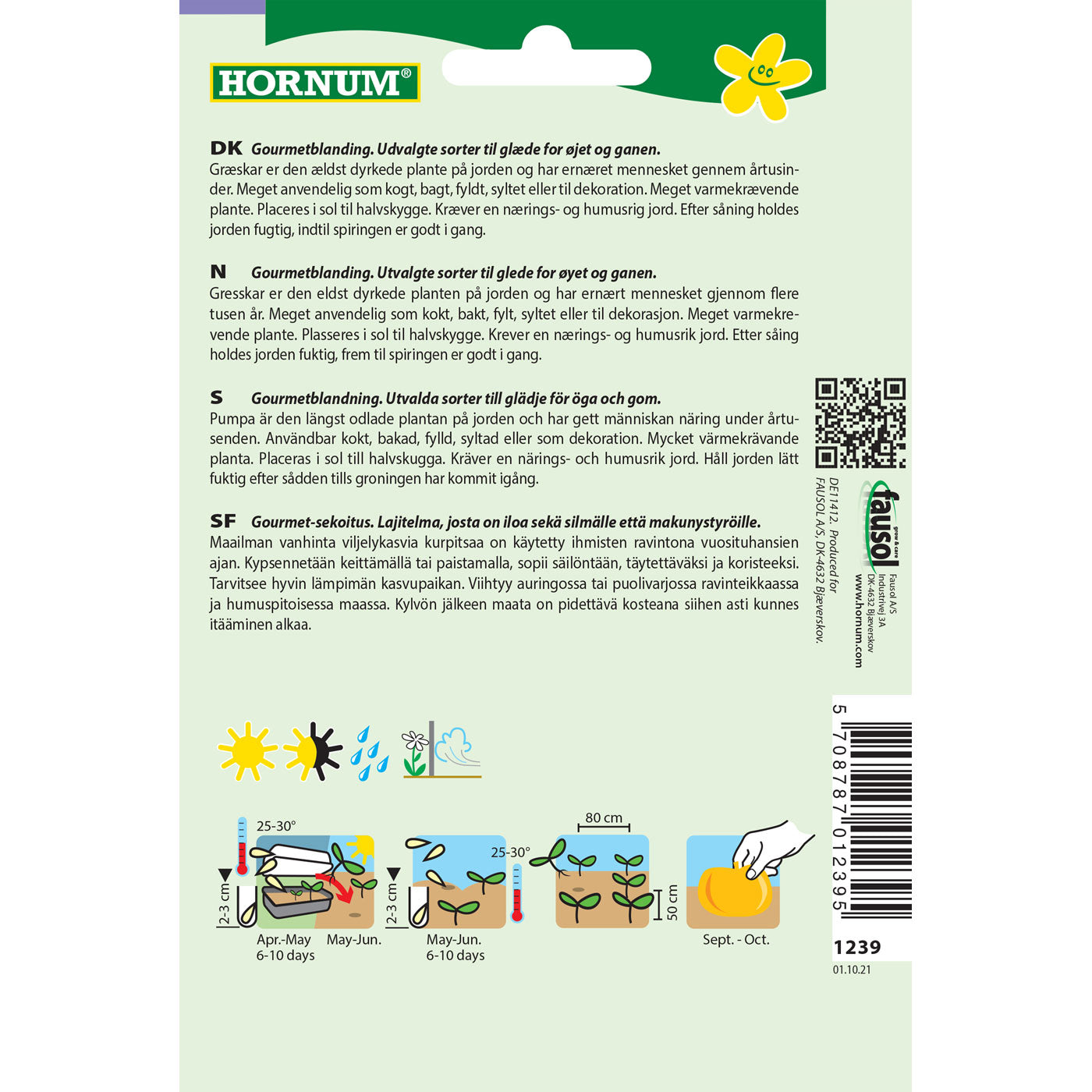 Græskar frø, gourmetblanding. Udvalgte sorter til glæde for både øjet og ganen. Græskar er den ældst dyrkede plante på jorden og har ernæret mennesket gennem årtusinder. Meget anvendelig som kogt, bagt, fyldt, syltet eller til dekoration. Meget varmekrævende plante. Placeres i sol til halvskygge. Kræver en nærings- og humusrig jord. Efter såning holdes jorden fugtig, indtil spiringen er godt i gang.