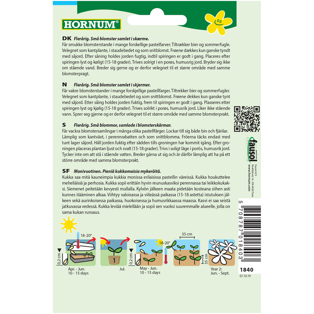 Den får små blomster samlet i skærme. Får smukke blomsterstande i mange forskellige pastelfarver. Tiltrækker bier og sommerfugle. Velegnet som kantplante, i staudebedet og som snitblomst. Frøene dækkes kun ganske tyndt med såjord. Efter såning holdes jorden fugtig, indtil spiringen er godt i gang. Placeres efter spiringen lyst og køligt (15-18 grader). Trives solrigt i en porøs, humusrig jord. Bryder sig ikke om stående vand. Breder sig gerne og er derfor velegnet til et større område med samme blomsterpragt.