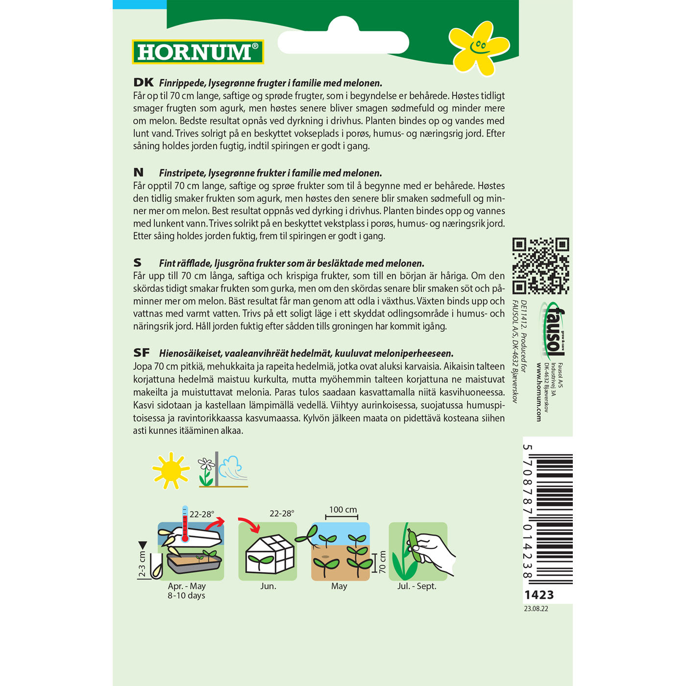 Frø af den spændende og meget specielle Armenische Carosello Barese melonagurk, der også galdes slangemelon. Planten med de finrippede, lysegrønne frugter er i familie med melonen. Får op til 70 cm lange, saftige og sprøde frugter, som i begyndelse er behårede. Høstes tidligt smager frugten som agurk, men høstes senere bliver smagen sødmefuld og minder mere om melon.