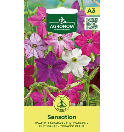 Frø af tobaksplanten Nicotiana alata 'Sensation', der er en et-årig plante på 40–80 cm i højden. Blomsterne er 5–7 cm i diameter, farverige og har en behagelig duft. Gode til buketter. Trives bedst i lyse, ikke-hede områder med delvis skygge, i moderat fugtig, frugtbar jord.